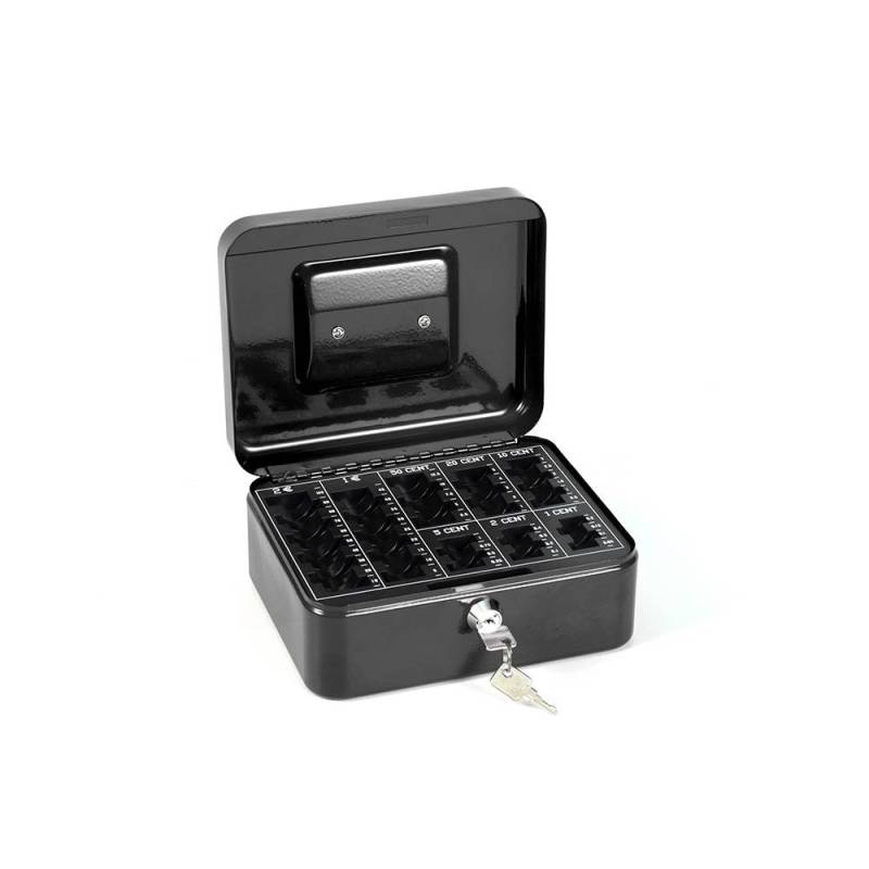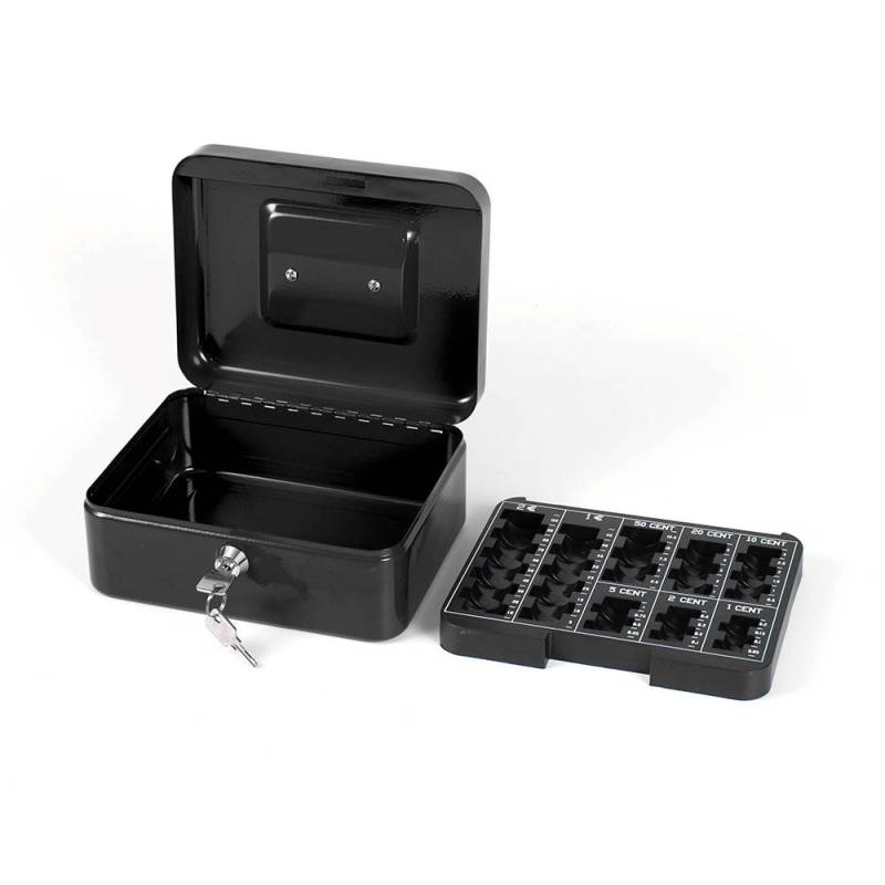 Caja con bandeja portamonedas Q-Connect. Estructura de 0,8 mm de acero.Con clasificador para monedas de euro.Incluye 2 juegos de llaves.Bandeja extraíble con hueco para billetes. Medidas: 200 x 160 x 90 mm. Color negro.