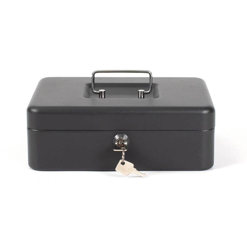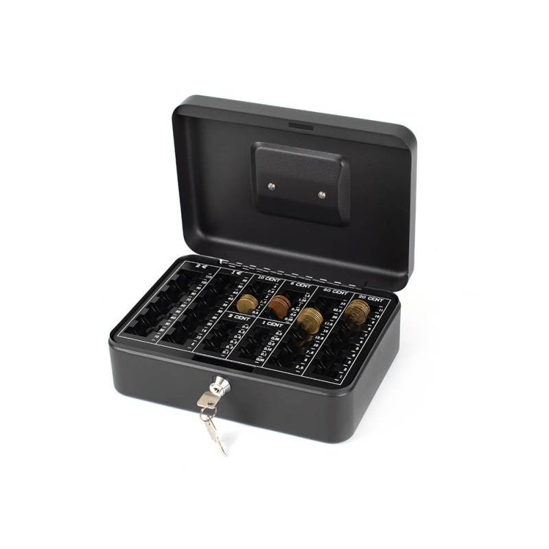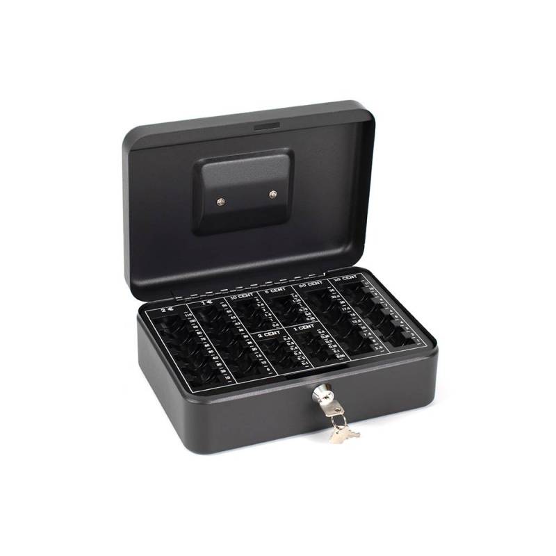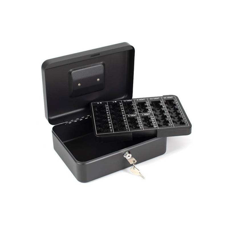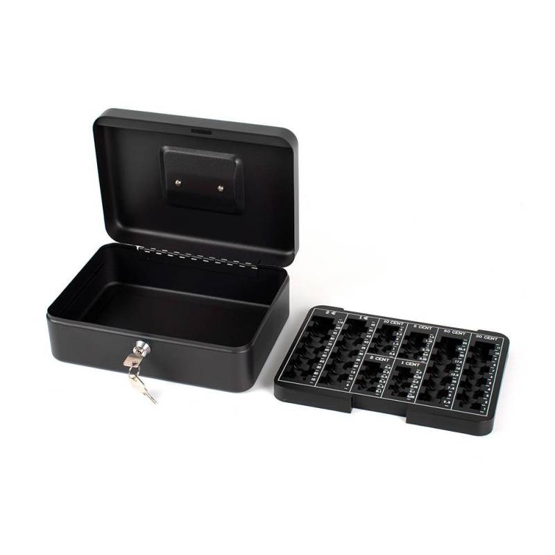 Caja con bandeja portamonedas Q-Connect. Estructura de 0,8 mm de acero.Con clasificador para monedas de euro. Incluye 2 juegos de llaves. Bandeja extraíble con hueco para billetes. Medidas: 250 x 180 x 90 mm. Color negro.