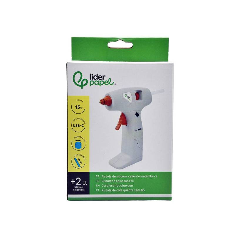La pistola de silicona caliente inalámbrica Liderpapel PS03 combina portabilidad y eficiencia para facilitar tus proyectos de manualidades, bricolaje y reparaciones. Su batería recargable mediante USB tipo-C garantiza autonomía, mientras que su diseño compacto y ligero ofrece comodidad y seguridad durante su uso. Compatible con barras de silicona de 7 mm, esta herramienta alcanza la temperatura ideal en pocos minutos para un pegado rápido y preciso. - Diseño inalámbrico: Permite total libertad de movimiento sin depender de cables, facilitando su uso en diferentes espacios y posiciones.