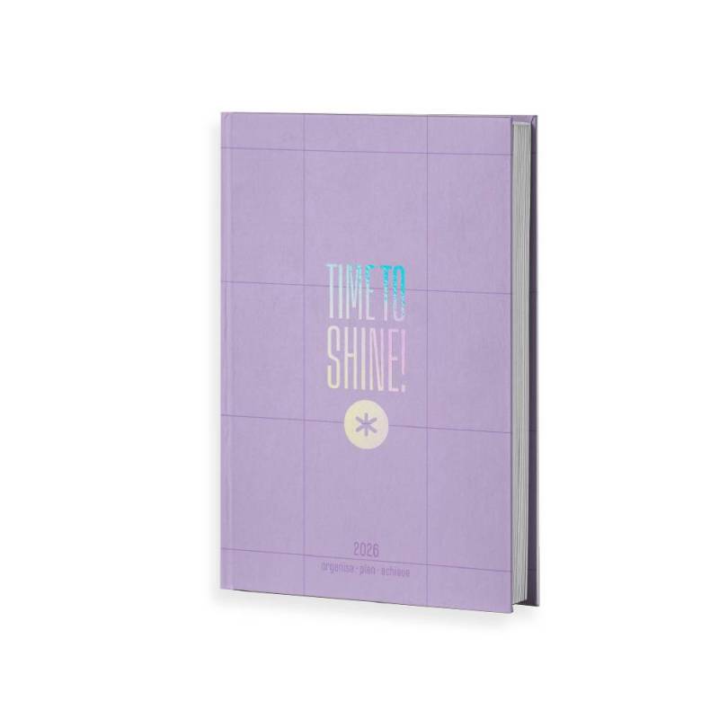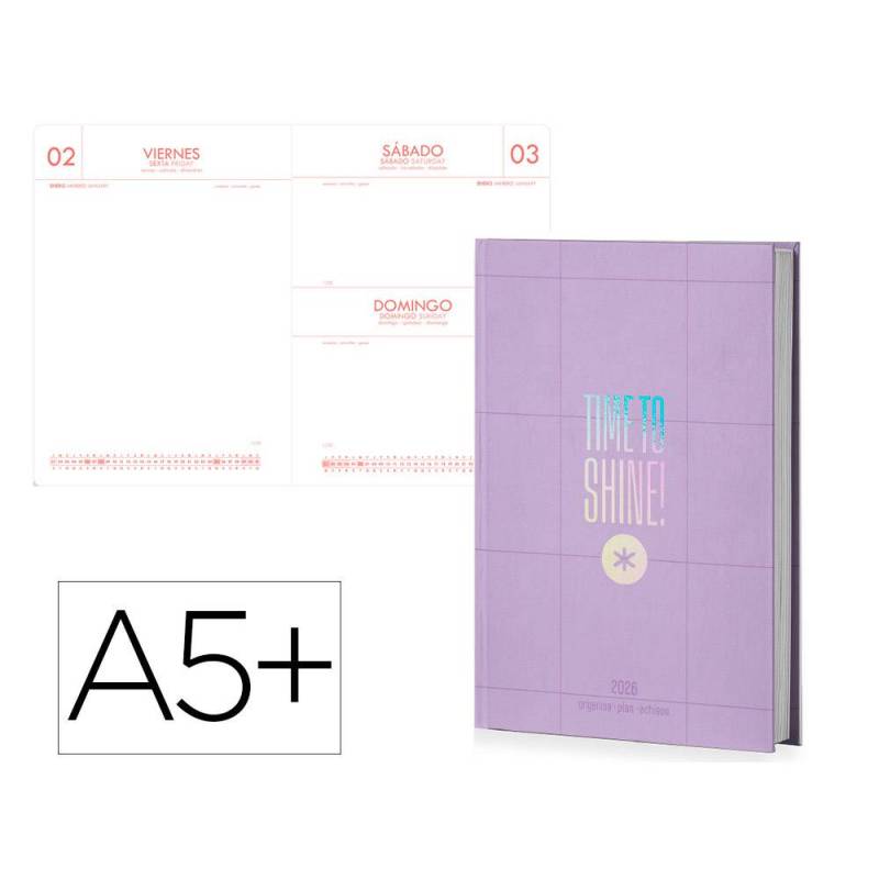 AGENDA ENCUADERNADA MARCA ANTARTIK TIME TO SHINE A5+ 2026 DÍA PÁGINA MORADO PAPEL 80G FSC