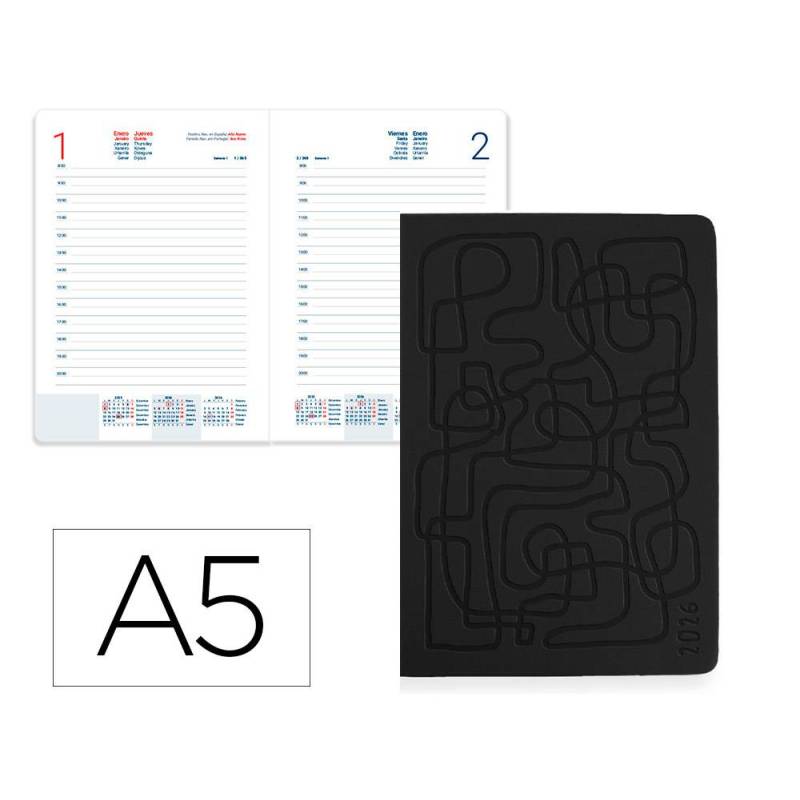 | Organiza tu año 2026 con esta agenda encuadernada en formato A5, que combina funcionalidad, durabilidad y un diseño elegante. Su formato de día por página te permite planificar cada jornada con detalle, mientras que su tapa rígida de simil piel en color negro aporta un acabado profesional y resistente. Además, el papel de 70 g/m² con certificación FSC asegura una escritura cómoda y un compromiso con el medio ambiente.