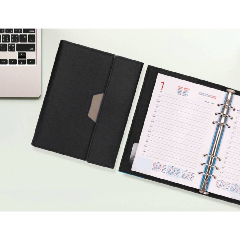 Organiza tu año 2026 con esta elegante y funcional agenda de anillas en formato día por página. Su tamaño de 150 x 210 mm ofrece la combinación perfecta entre portabilidad y espacio para anotaciones diarias, mientras que su tapa de simil piel negra con detalles grises aporta un toque sofisticado y duradero. Ideal para quienes valoran un diseño clásico y una planificación detallada, esta agenda está diseñada para acompañarte en tus actividades diarias con materiales de calidad y opciones prácticas.