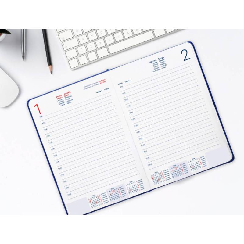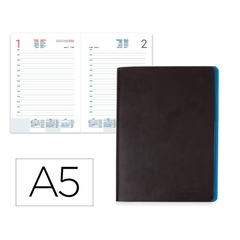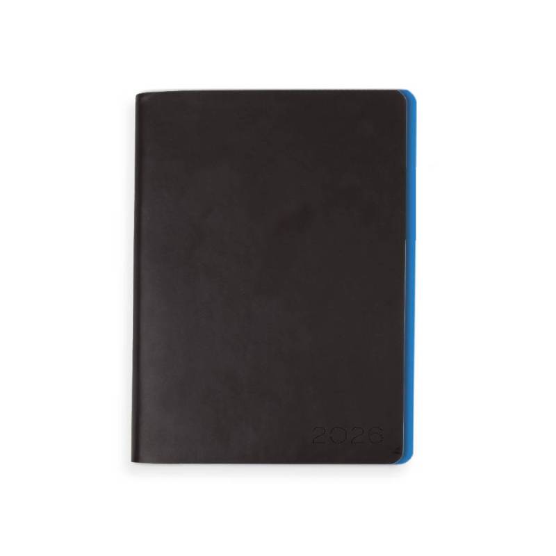 | Organiza tu año 2026 con esta agenda encuadernada en formato A5, diseñada para ofrecerte un amplio espacio de planificación con un sistema de día por página. Su tapa de simil piel flexible aporta un acabado profesional y resistente, mientras que el borde de las páginas en color azul añade un detalle distintivo y elegante. Ideal para llevar siempre contigo, combina funcionalidad y sostenibilidad gracias a su papel certificado FSC.