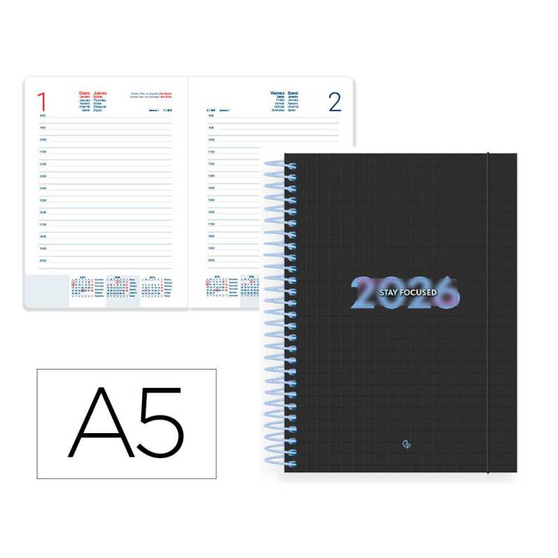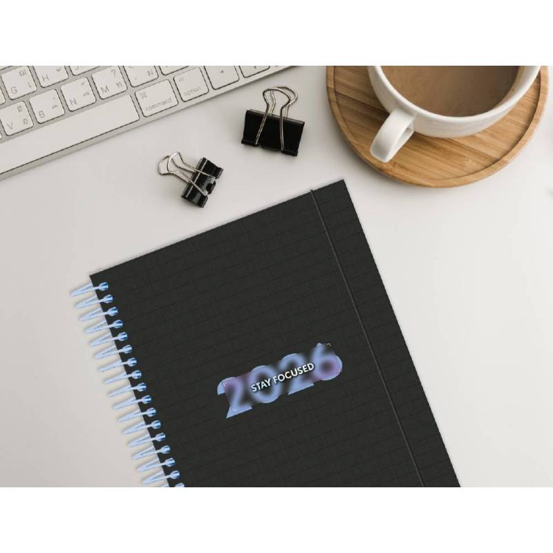 Organiza tu año 2026 con esta agenda de formato A5, diseñada para ofrecer un espacio diario amplio y eficiente para planificar cada jornada. Su encuadernación en espiral permite una apertura total, facilitando la escritura y consulta en ambas caras de la página. El diseño incluye una portada elegante con acabado soft touch y detalles iridiscentes que aportan un toque moderno y motivador con el mensaje STAY FOCUS, ideal para mantener la concentración en tus objetivos diarios.