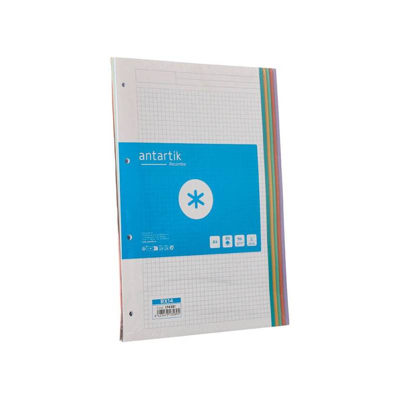 RECAMBIO A4 MARCA ANTARTIK 80 HOJAS 90G/M2 CUADRO 5 MM 4 TALADROS BANDAS DE 5 COLORES PASTELES