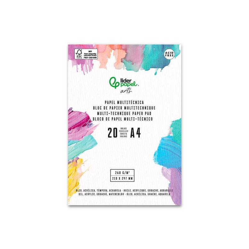 BLOC PAPEL MULTITECNICA MARCA LIDERPAPEL DIN A4 PARA ACRILICO OLEO Y GOUACHE 20 HOJAS GRAMAJE 260G/M2