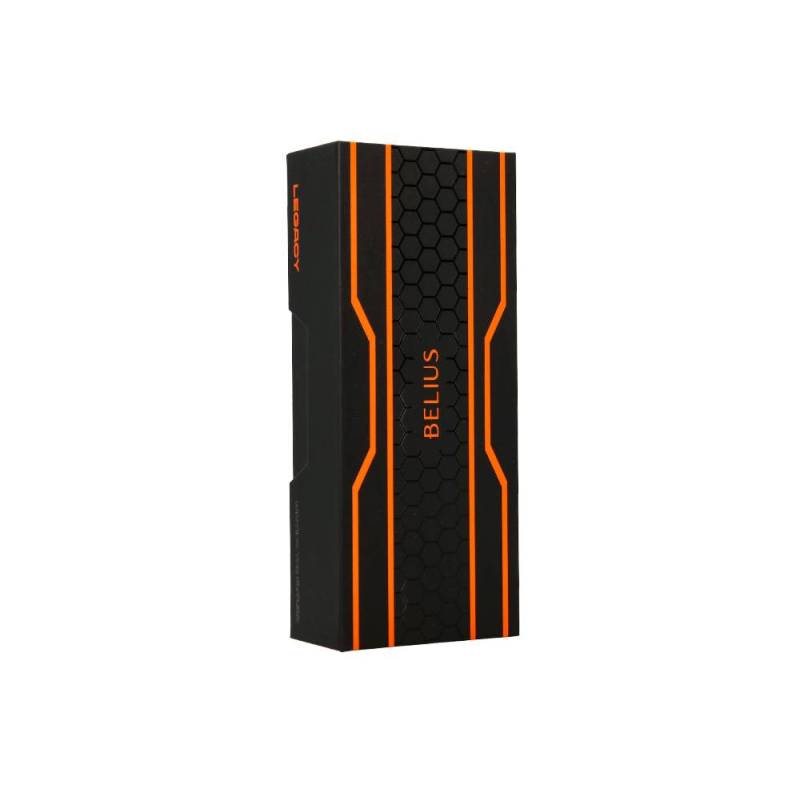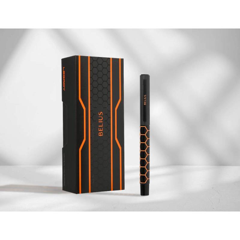BOLIGRAFO MARCA BELIUS LEGACY ALUMINIO DISEÑO HEXAGONO NARANJA CUERPO NEGRO TINTA COLOR AZUL CAJA DE DISEÑO