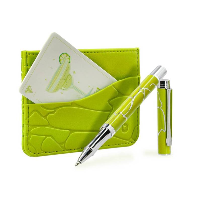 BOLIGRAFO Y WALLET MARCA BELIUS COCKTAILS MARGARITA ALUMINIO VERDE LIMA PLATEADO RELIEVE TINTA COLOR AZUL CAJA DE