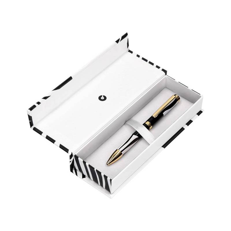 El bolígrafo dualità combina un diseño moderno y atrevido, con un cuerpo en color negro decorado con trazos estilo cebra en blanco y detalles metálicos dorados. Viene presentado en una moderna caja de cierre magnético que juega con la inversión de colores, incorporando una solapa interior en contraste. El diseño en blanco y negro invertidos representa el contraste y la dualidad presentes en la juventud, capturando su energía. La colección se caracteriza por su diseño elegante, contemporáneo con un estilo único. Cada detalle ha sido cuidadosamente elegido para crear un impacto visual fuerte y llamativo. Tinta color azul. Grosor tamaño 1 mm. Más modelos disponibles |