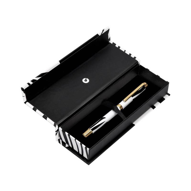 El roller dualità combina un diseño moderno y atrevido, con un cuerpo en blanco decorado con trazos estilo cebra en negro y detalles metálicos dorados. Viene presentado en una moderna caja de cierre magnético que juega con la inversión de colores, incorporando una solapa interior en contraste. El diseño en blanco y negro invertidos representa el contraste y la dualidad presentes en la juventud, capturando su energía. La colección se caracteriza por su diseño elegante, contemporáneo con un estilo único. Cada detalle ha sido cuidadosamente elegido para crear un impacto visual fuerte y llamativo. Tinta color negro. Grosor tamaño 0,7 mm. Más modelos dispnibles |