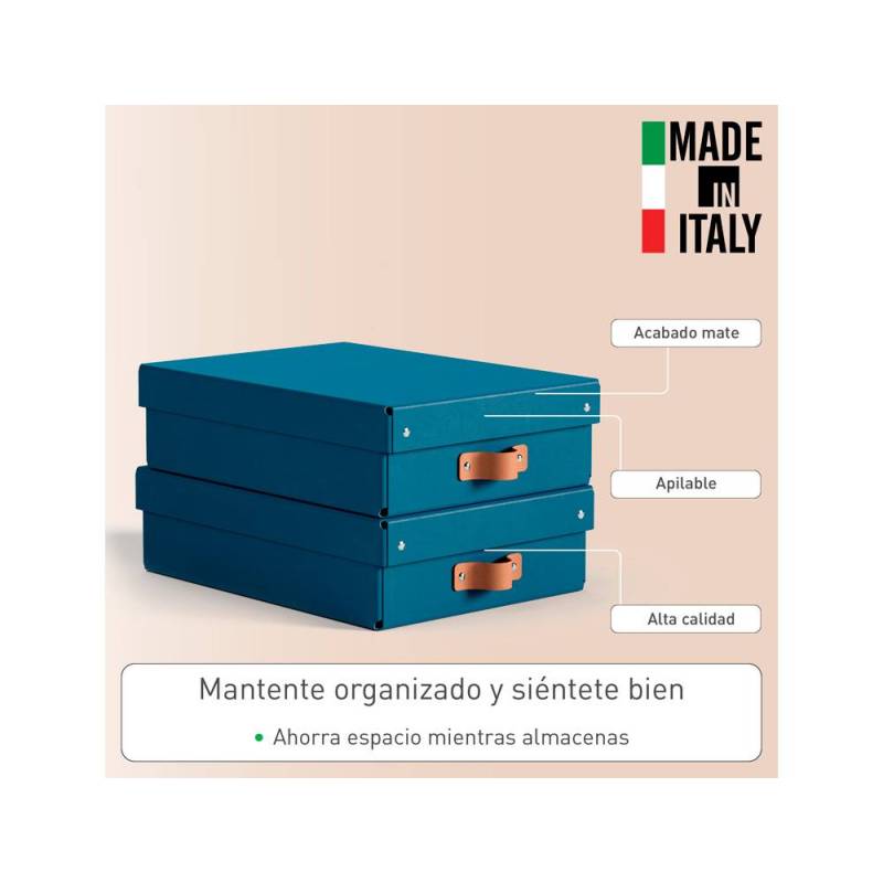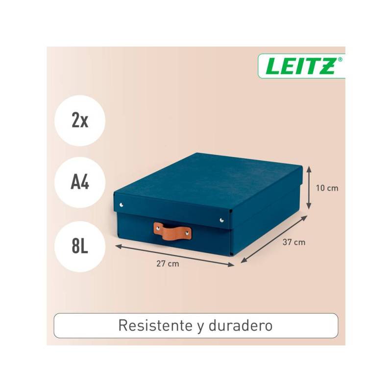 CAJA DE ALMACENAJE MARCA LEITZ CARTON MEDIANA BAJA CON ASA DE PIEL COLOR AZUL PACK DE 2 UNIDADES