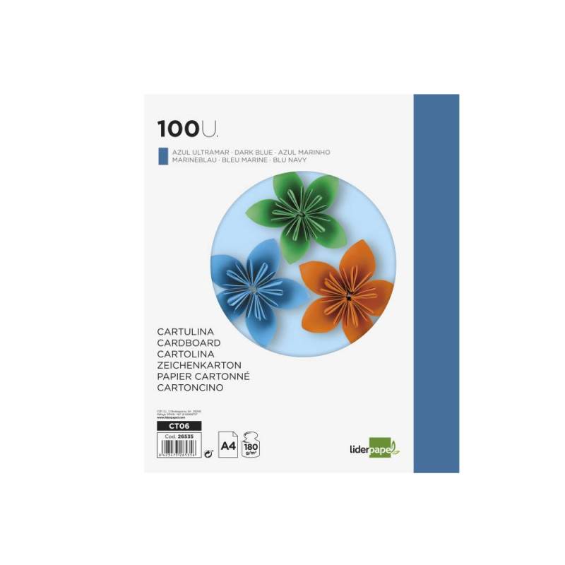 Cartulina Liderpapel. Color azul ultramar. Tamaño DIN A4. Gramaje 180 g/m2. Por su completa gama de colores es un complemento ideal para la utilización escolar. Se pega fácilmente con los pegamentos escolares. Ideal también para cartelería. Paquete de 100 unidades.