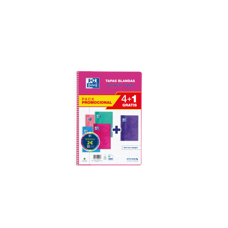 CUADERNO MARCA ESPIRAL OXFORD TAPA BLANDA FOLIO 80 HOJAS 90GR CUADRO 4 MM COLORES TENDENCIAS PACK DE 4+1