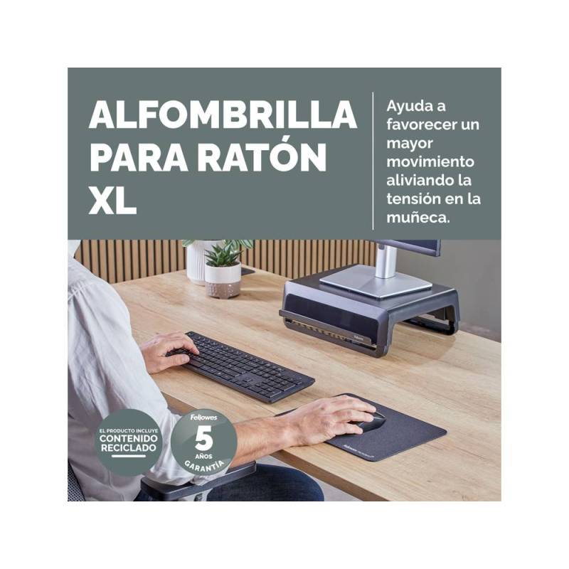 La alfombrilla para ratón Fellowes Breyta XL en color negro es un accesorio extragrande diseñado para brindar una mayor comodidad y precisión durante el uso diario del ratón. Con un 22% más de superficie que una alfombrilla estándar, permite movimientos amplios que ayudan a reducir la tensión repetitiva en la muñeca, favoreciendo un mejor rendimiento en tareas de oficina, estudio o diseño.