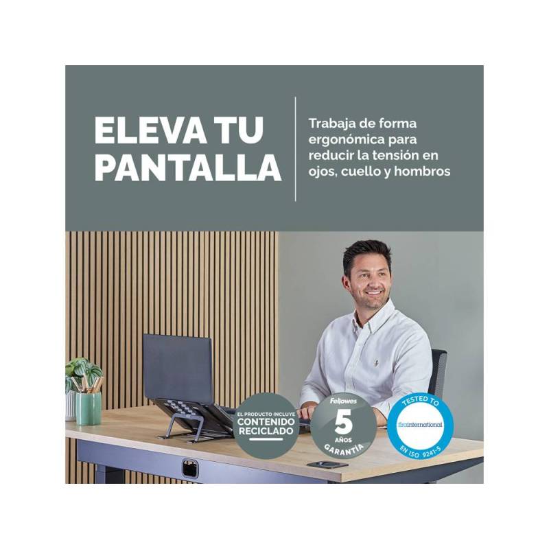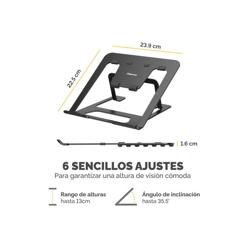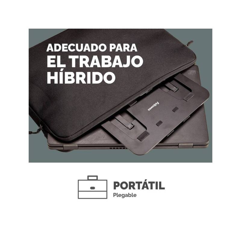 Optimiza tu espacio de trabajo con este soporte plegable que eleva tu portátil a una altura ergonómica, contribuyendo a reducir la tensión ocular, cervical y en los hombros. Su diseño ligero y compacto facilita el transporte y almacenamiento, adaptándose perfectamente a entornos de trabajo híbridos o móviles, mientras garantiza una sujeción segura y una mejor ventilación para mantener el equipo en condiciones óptimas.