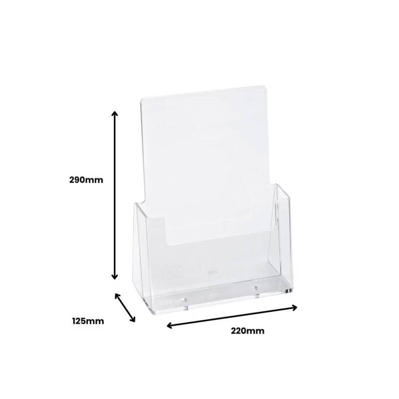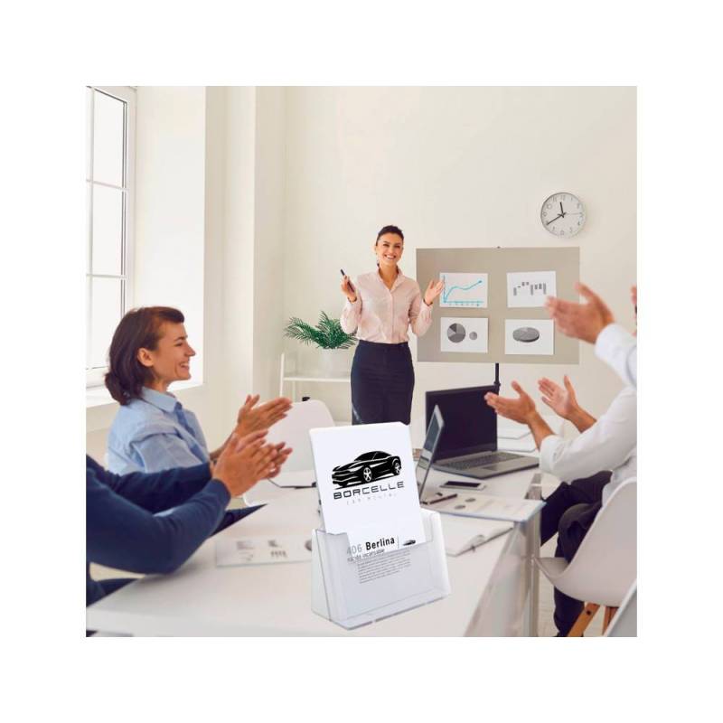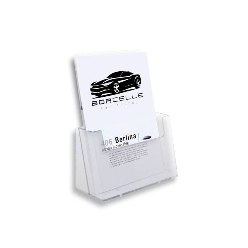 Este expositor sobremesa para folletos en formato A4 vertical es una solución práctica y elegante para organizar y mostrar documentos en entornos profesionales. Fabricado en poliestireno transparente de alta resistencia, combina durabilidad con una excelente visibilidad del contenido, ideal para oficinas, recepciones, hoteles o comercios que requieren una presentación clara y accesible del material informativo.