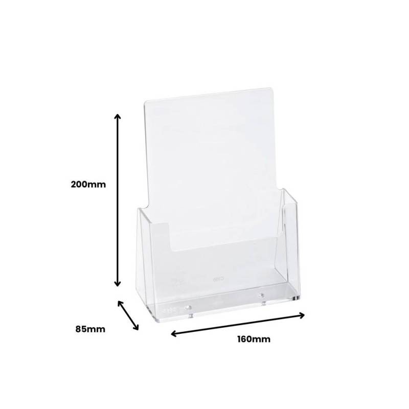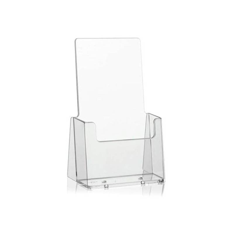 Este expositor sobremesa está especialmente diseñado para la presentación y organización eficiente de folletos y documentos en formato A5 en posición vertical. Fabricado en poliestireno transparente, combina resistencia y estabilidad, facilitando una visualización clara del contenido y un acceso rápido gracias a su hendidura frontal. Su diseño compacto y robusto lo hace ideal para entornos profesionales que requieren una presentación ordenada y accesible de material informativo.