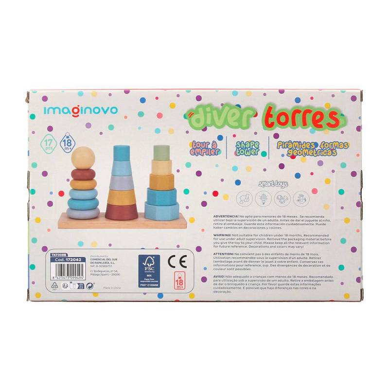 JUEGO INFANTIL MARCA IMAGINOVO MADERA TORRE DE FORMAS APILABLES +18 MESES 17 PIEZAS 28X20X9CM