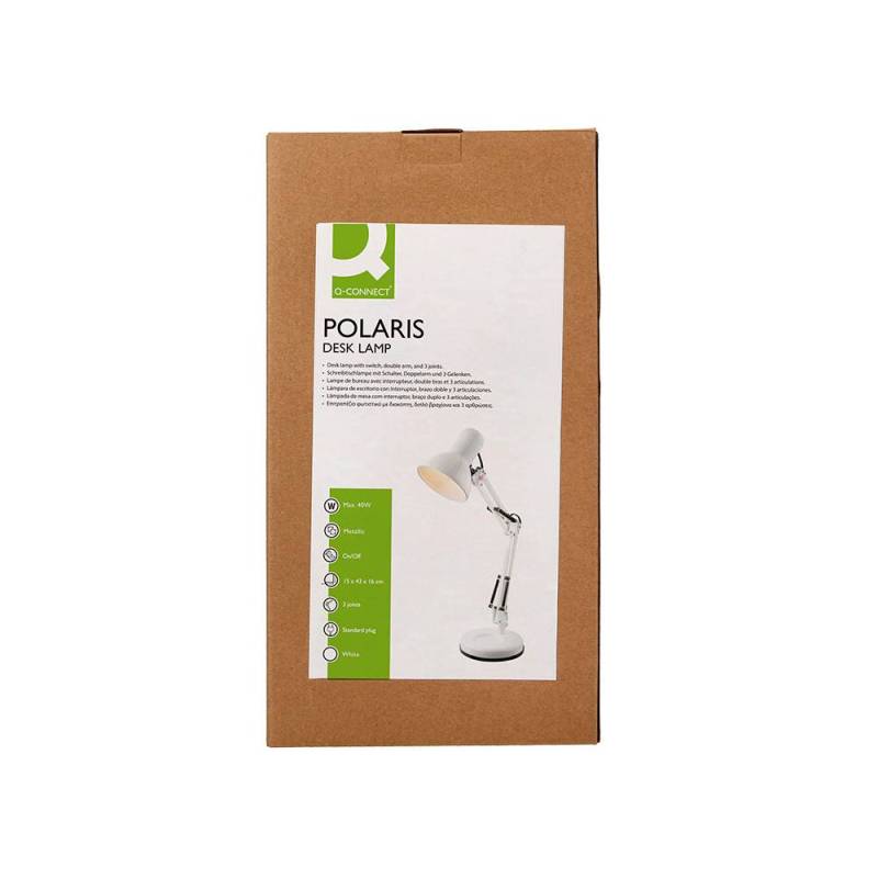 Esta lámpara de escritorio Q-Connect Polaris combina funcionalidad y resistencia en un diseño metálico blanco que se adapta fácilmente a diferentes ambientes. Su estructura robusta y brazo articulado con tres puntos de movimiento permiten una iluminación precisa y personalizada, ideal para espacios de trabajo, estudio o lectura. Además, incluye un interruptor integrado que facilita el encendido y apagado de forma rápida y práctica.