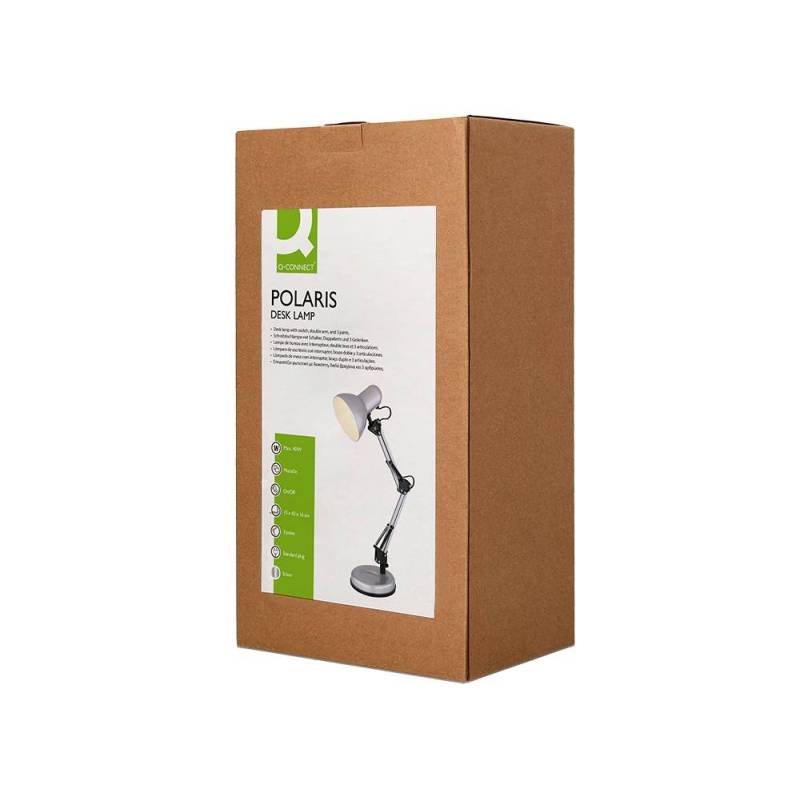 La lámpara de escritorio Q-Connect Polaris combina funcionalidad y diseño moderno en un accesorio imprescindible para espacios de trabajo y estudio. Su estructura metálica plateada ofrece resistencia y estabilidad, mientras que su brazo doble con tres articulaciones facilita una iluminación precisa y adaptable a diversas necesidades.
