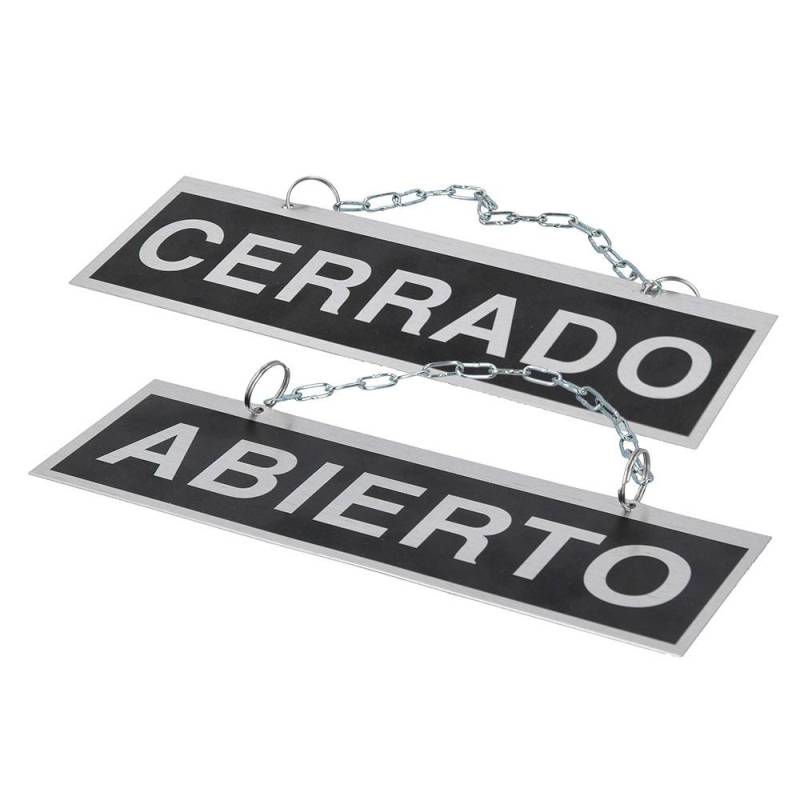 Letrero metalico serigrafiado abierto y cerrado con cadena y ventosa para colgar de 74x232 mm