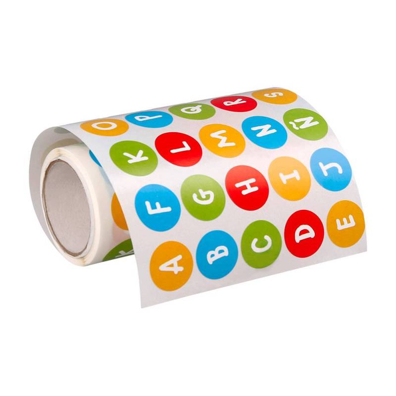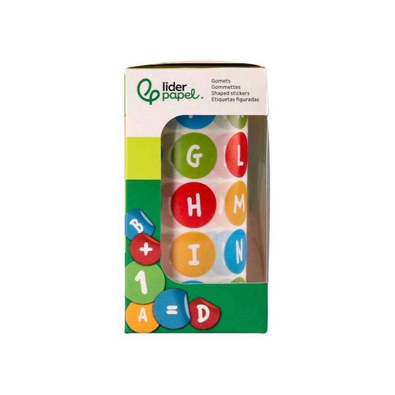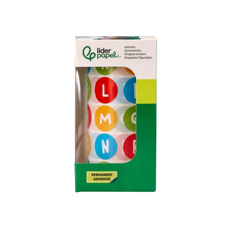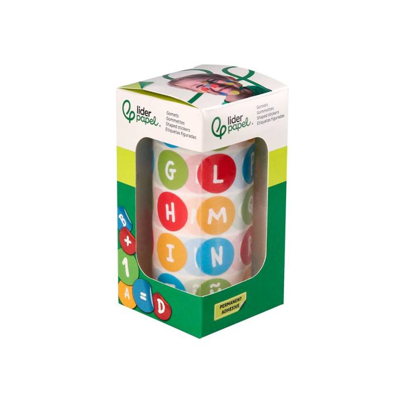GOMETS MARCA LIDERPAPEL AUTOADHESIVO S REDONDO ABECEDARIO 20 MM COLORES SURTIDOS ROLLO DE 1000 UNIDADES EN CAJA DE CARTON