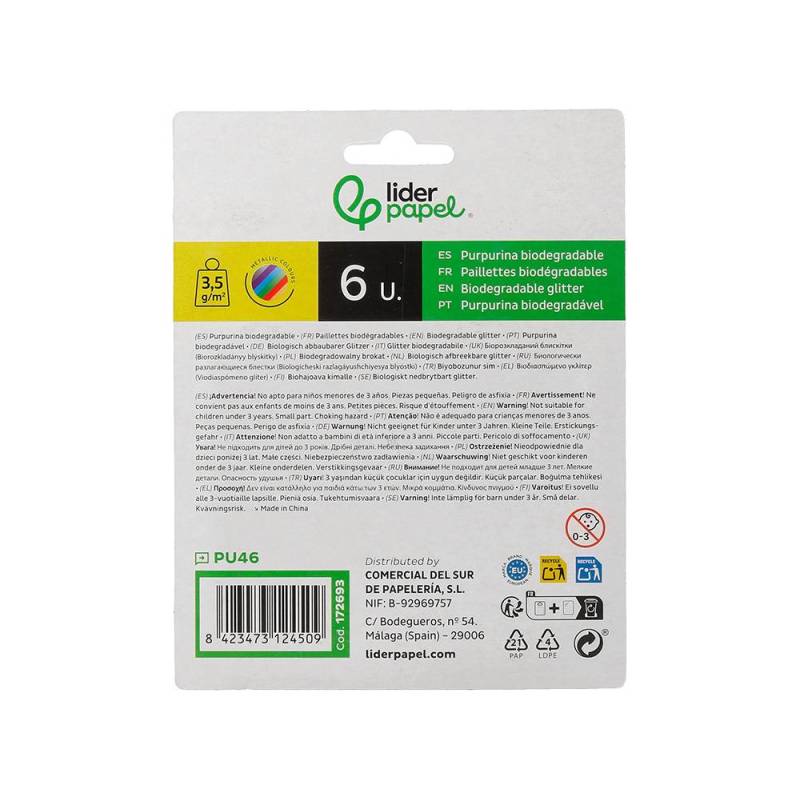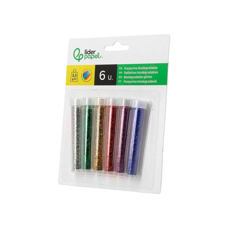 PURPURINA MARCA LIDERPAPEL BIODEGRADABLE FANTASIA BOTE DE 3,5 GR COLORES METALICOS SURTIDOS BLISTER DE 6