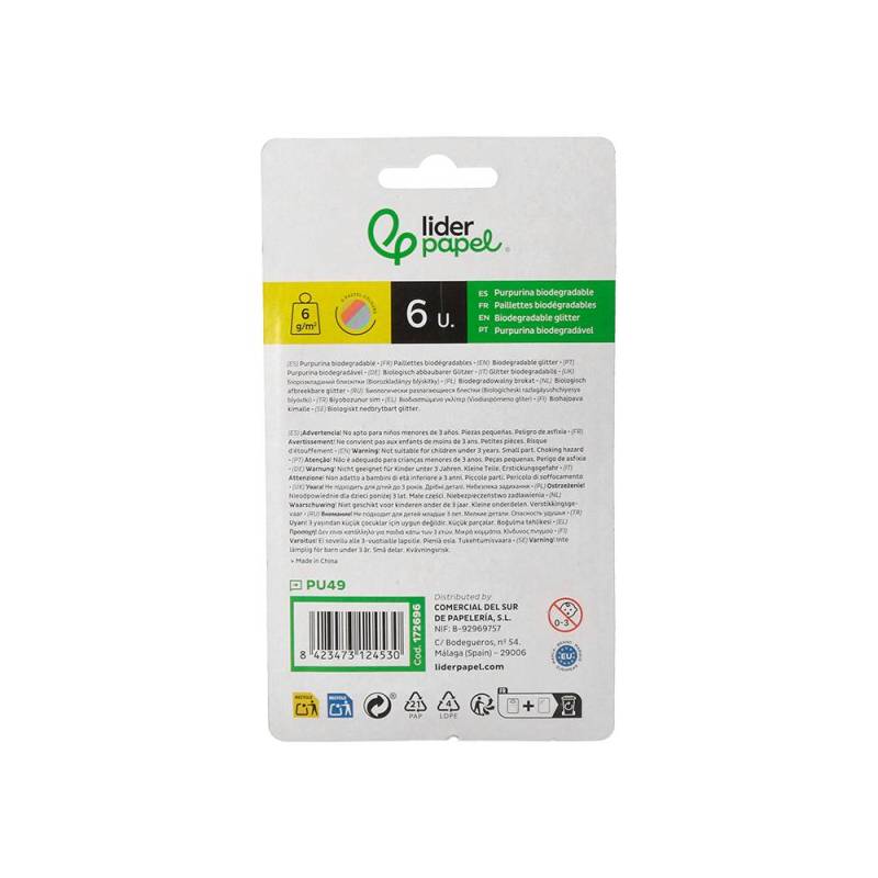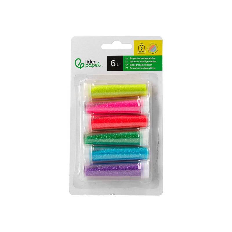 PURPURINA LIDERPAPEL BIODEGRADABLE FANTASIA BOTE DE 6 GR COLORES METALICOS PASTELES SURT BLISTER DE 6 UND
