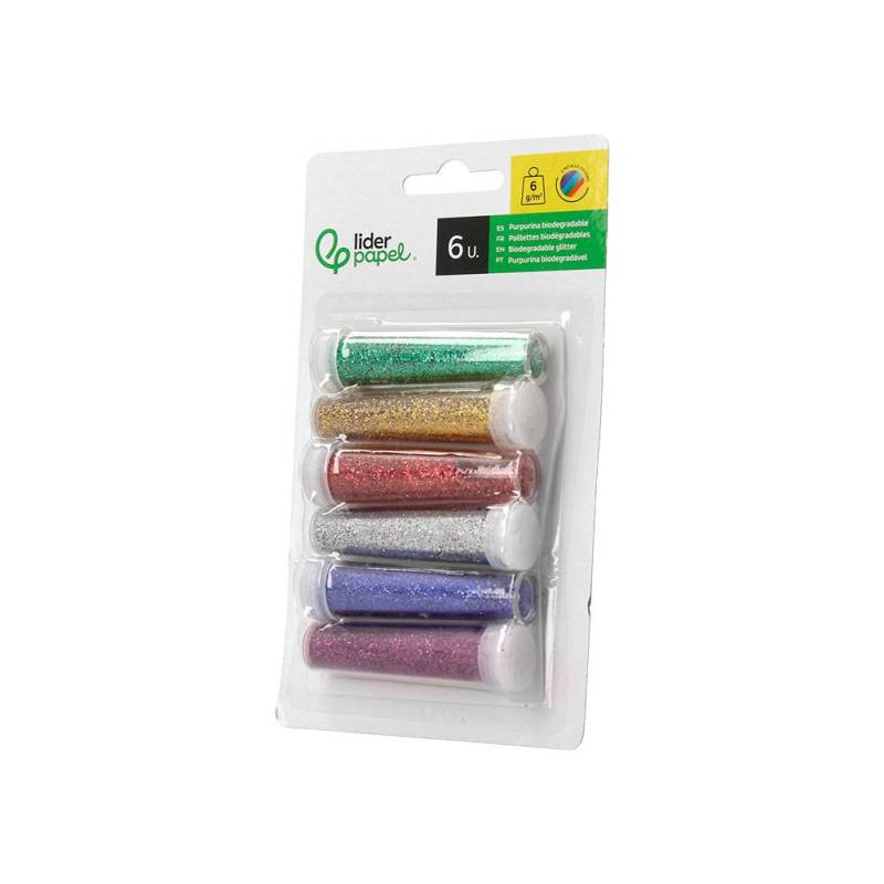 PURPURINA MARCA LIDERPAPEL BIODEGRADABLE FANTASIA BOTE DE 6 GR COLORES METALICOS SURTIDOS BLISTER DE 6