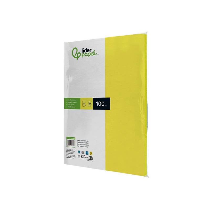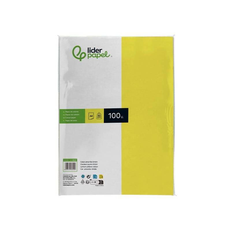Papel color de la marca Liderpapel. Gramaje 80 g/m2. Cuenta con 100 hojas. Tamaño Din A4. Idóneos para impresoras ink-jet, láser y fotocopiadoras. Color limon.