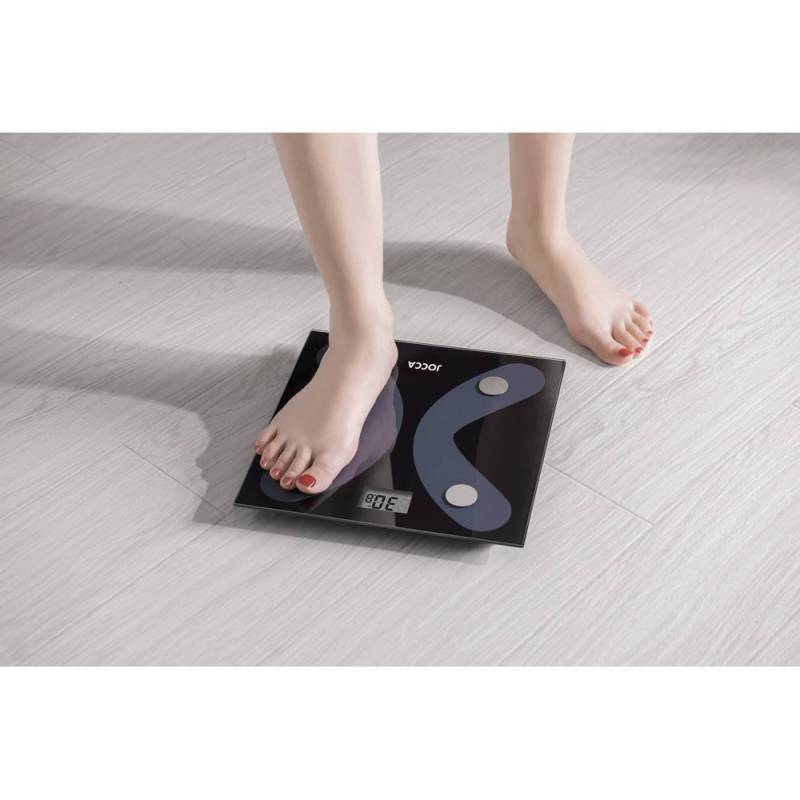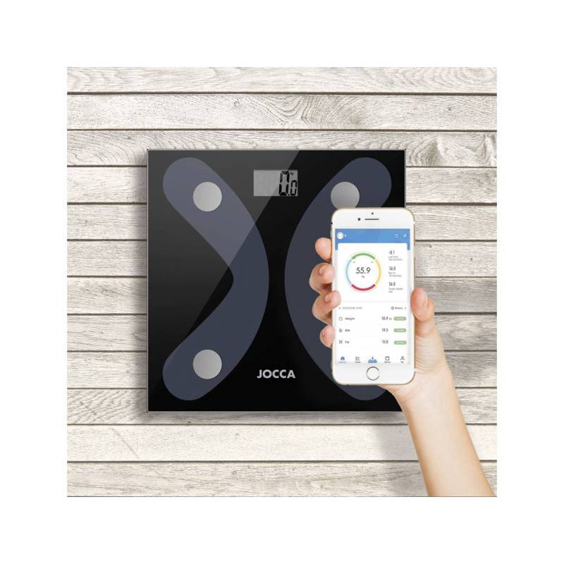 Báscula de baño de la marca Jocca. Fabricado en vidrio templado de seguridad. Con memoria. Mide el índice de masa corporal. Peso máximo 150 kg. Plato de pesaje de 6 mm de grosor. Display LCD de 70 x 28 mm. Función auto apagado. Indicador de batería baja y sobrepeso. Memoria para un máximo de 10 personas (sexo-edad-altura). 3v dc(2 x cr2032 3v). Pilas incluidas. Medidas: 290 x 40 x 330 mm. Peso: 1,481kg.
