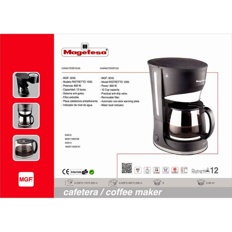 La cafetera Ristretto Magefesa MGF3245 es una excelente opción para quienes buscan preparar café estilo espresso o ristretto con sabor intenso y concentración óptima. Con capacidad para 12 tazas, resulta ideal para uso familiar o en entornos laborales pequeños, ofreciendo una preparación rápida gracias a su potencia de 800 W y características que facilitan su limpieza y mantenimiento.