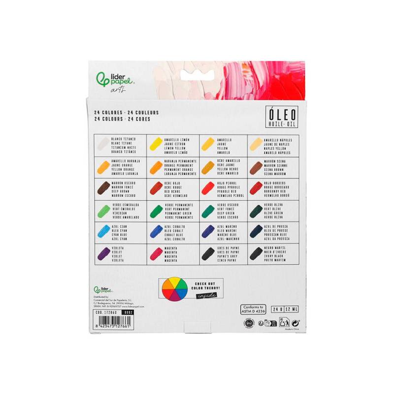 Este set de pintura al óleo en tubos de 12 ml ofrece una completa paleta de 24 colores surtidos, ideal para artistas que desean una amplia variedad para sus creaciones. La fórmula basada en pigmentos y aceites vegetales proporciona una textura rica y cremosa, con una gran intensidad y durabilidad del color. Su presentación en tubos de aluminio facilita la dosificación y conservación, haciendo de este pack una solución práctica para quienes trabajan en técnicas clásicas del óleo. - Composición: Pintura al óleo con pigmentos de alta calidad y aceites secantes que garantizan una textura cremosa y un secado lento.