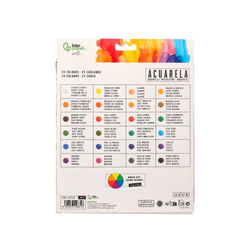 Este set de pintura de acuarela incluye 24 tubos de aluminio con 12 ml de pintura en cada uno, ofreciendo una amplia gama de colores surtidos que facilitan la creación de obras con gran riqueza tonal y detalles precisos. Ideal para técnicas que requieren transparencia y efectos luminosos, este pack es adecuado tanto para principiantes como para artistas que buscan versatilidad y calidad en sus materiales.