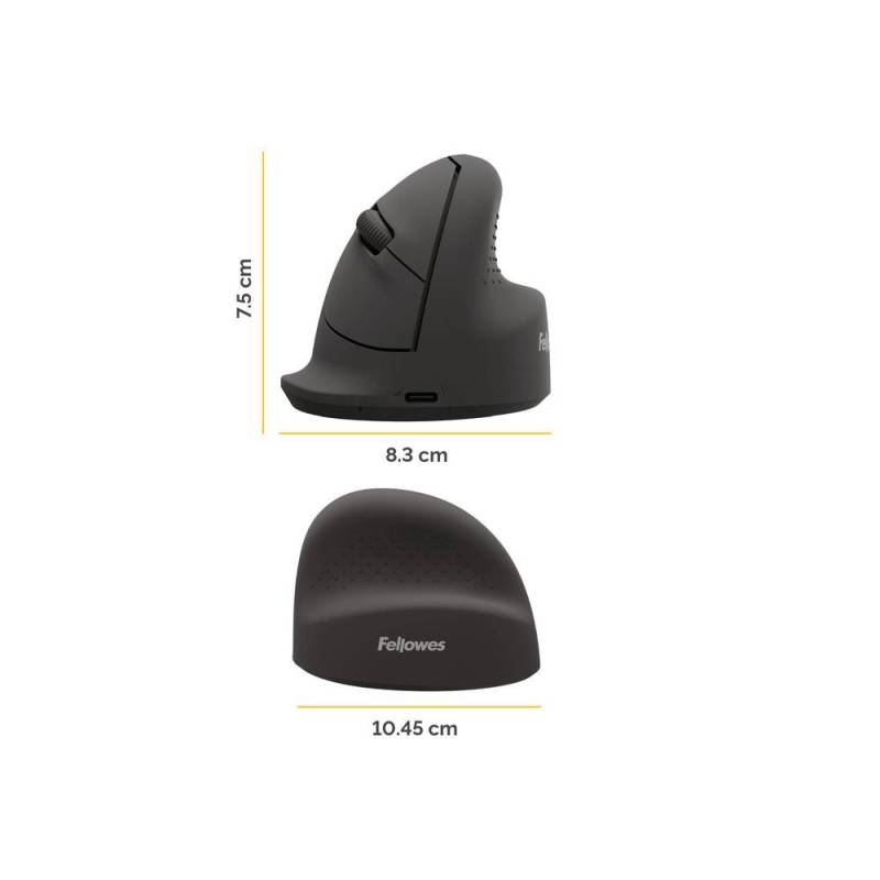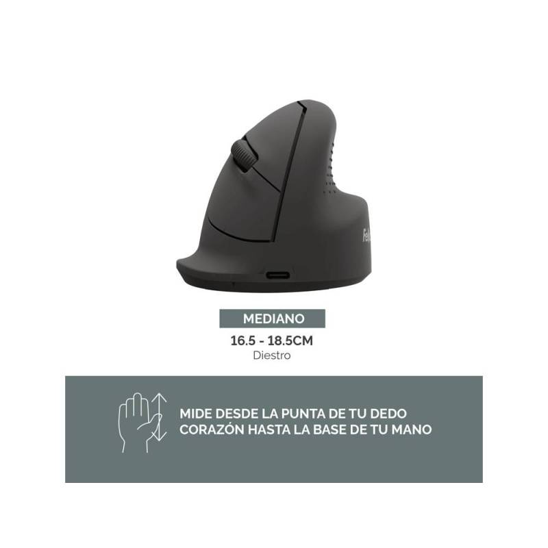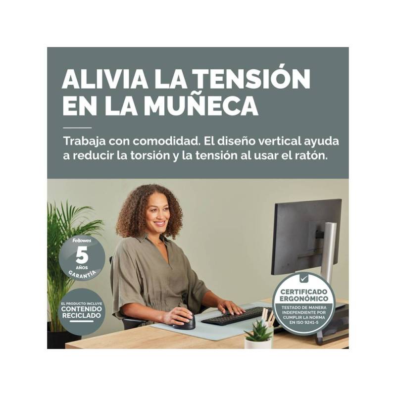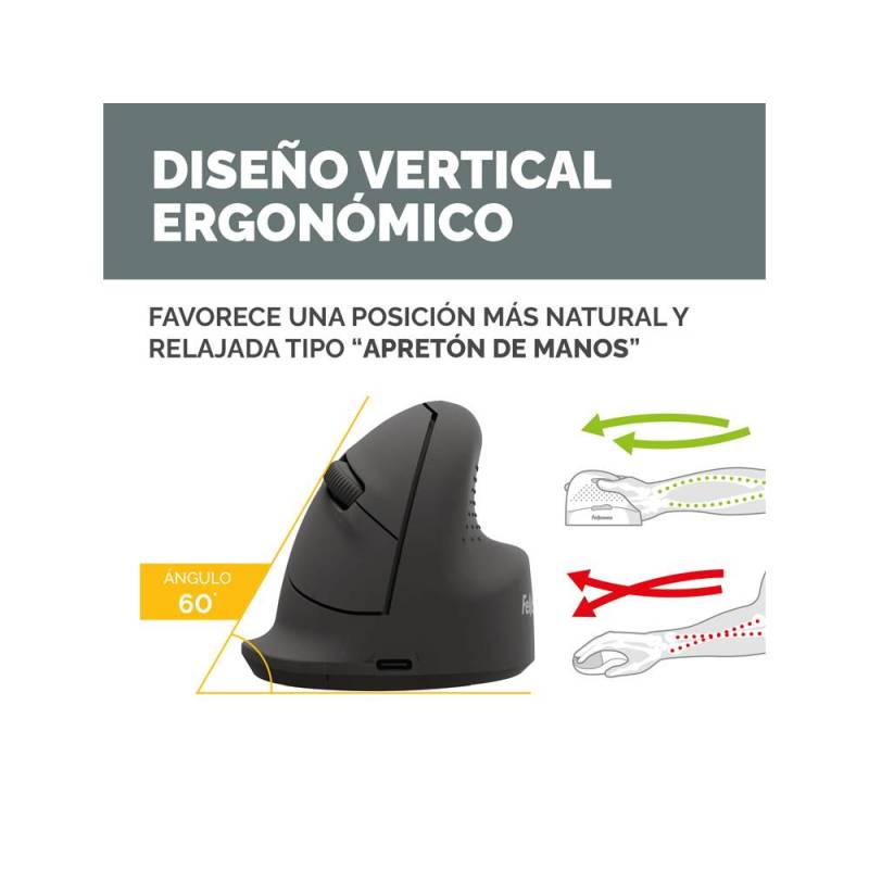 El ratón Fellowes Ergonómico Vertical Breyta Mediano para diestros es una solución avanzada para quienes buscan confort y salud postural en el uso diario del ordenador. Su diseño vertical con un ángulo de 60 grados permite una posición natural de la mano, reduciendo significativamente la tensión en la muñeca y el antebrazo. Además, su conectividad dual (inalámbrica Bluetooth y alámbrica USB Type-C) ofrece gran versatilidad, mientras que su sensor óptico de alta precisión con resolución ajustable hasta 1600 DPI garantiza un seguimiento preciso y un desplazamiento ágil. - Diseño ergonómico vertical: Minimiza la tensión muscular y reduce el riesgo de lesiones por esfuerzo repetitivo.