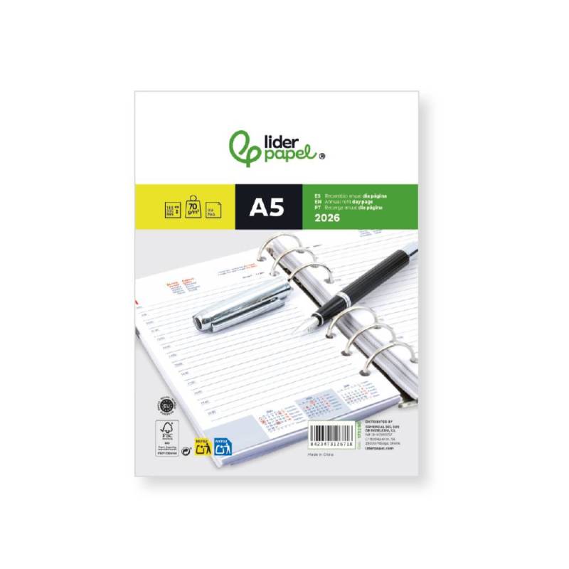 RECAMBIO AGENDA ANILLAS MARCA LIDERPAPEL 148X205 MM DIN A5 2026 DIA PAGINA PAPEL 70 GR
