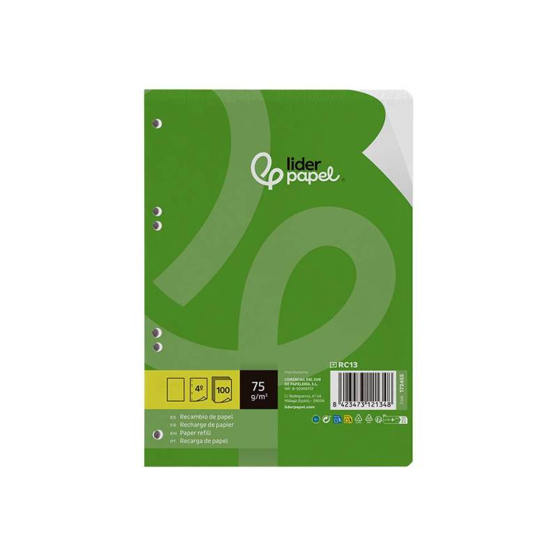 RECAMBIO MARCA LIDERPAPEL DIN A5 100 HOJAS 75 GR LISO SIN MARGEN 6 TALADROS