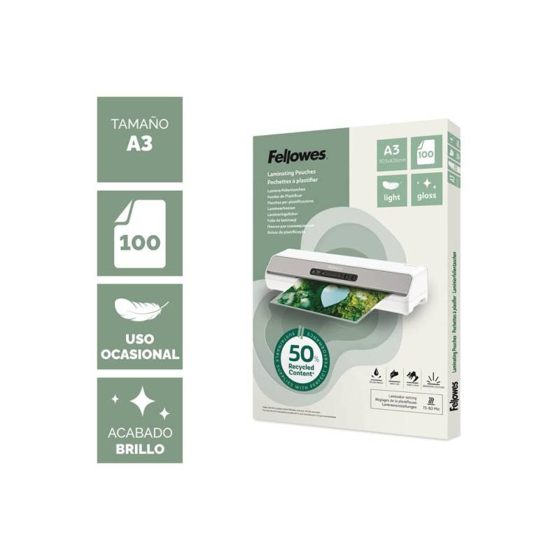 Las bolsas de plastificar Fellowes recicladas con acabado brillo en formato DIN A3 y grosor de 80 micras ofrecen una solución práctica y ecológica para proteger documentos importantes. Con un paquete de 100 unidades, están diseñadas para encapsular y preservar materiales de tamaño A3, garantizando una presentación profesional y duradera gracias a su resistencia y acabado brillante.