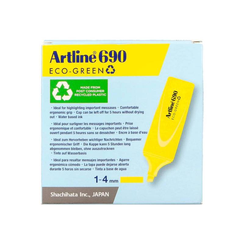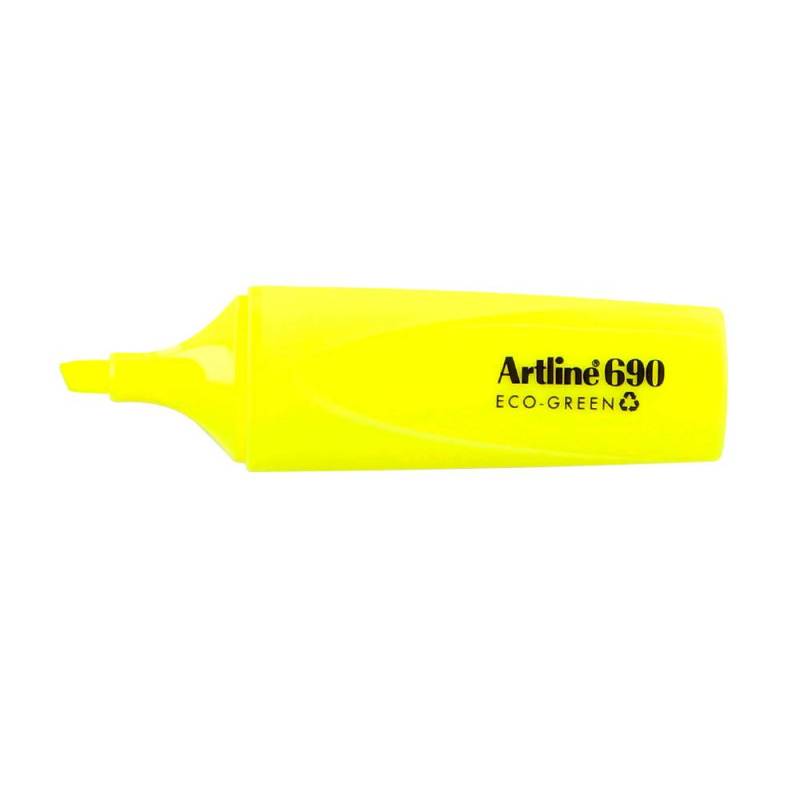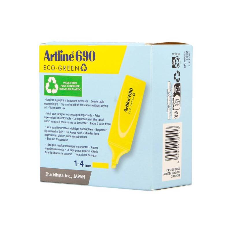 El rotulador fluorescente amarillo EK-690 Eco Green de Artline combina alta visibilidad con un compromiso ambiental, ofreciendo un marcador eficaz y sostenible para resaltar textos y realizar proyectos creativos. Su punta biselada de fibra de poliéster permite trazos de grosor variable, adaptándose a distintas necesidades de subrayado y marcado.