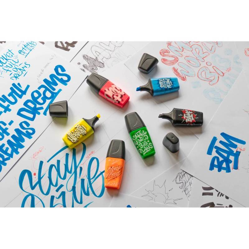 Estuche con 6 marcadores fluorescente mini stabilo boss mini by snooze one. Mensajes geniales diseñados en estilo grafiti diseñadas por el artista snooze one hacen de este fluorescente toda una declaración. Con la probada calidad del stabiloboss combinada con un diseño pequeño y actual. Tecnología stabilo anti-secado: 4 horas de protección para concentrarse en el trabajo. 2 anchos de trazo: 2 + 5 mm. Tinta con base acuosa. Más modelos disponibles |