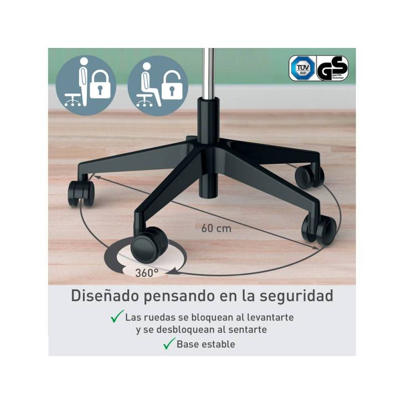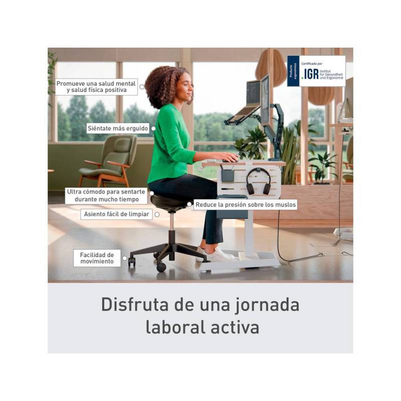 El taburete Leitz Ergo con asiento triangular es una solución ergonómica diseñada para brindar comodidad y funcionalidad durante toda la jornada laboral. Su asiento de espuma de doble densidad, combinado con un diseño que favorece una postura activa, ayuda a reducir la presión en las piernas y mejorar el bienestar físico. Su estructura robusta y movilidad gracias a cinco ruedas giratorias lo convierten en un complemento ideal para oficinas, talleres o estudios.