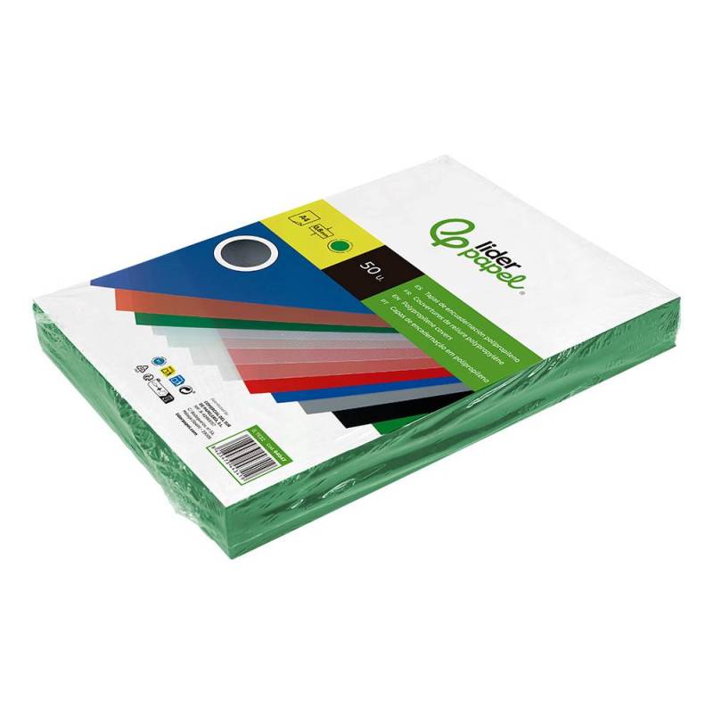 Tapas de encuadernación de la marca Liderpapel. Material: Polipropileno. Tamaño: DIN A4. Grosor: 0.8 mm. Color: verde. Caja de 50 unidades.